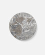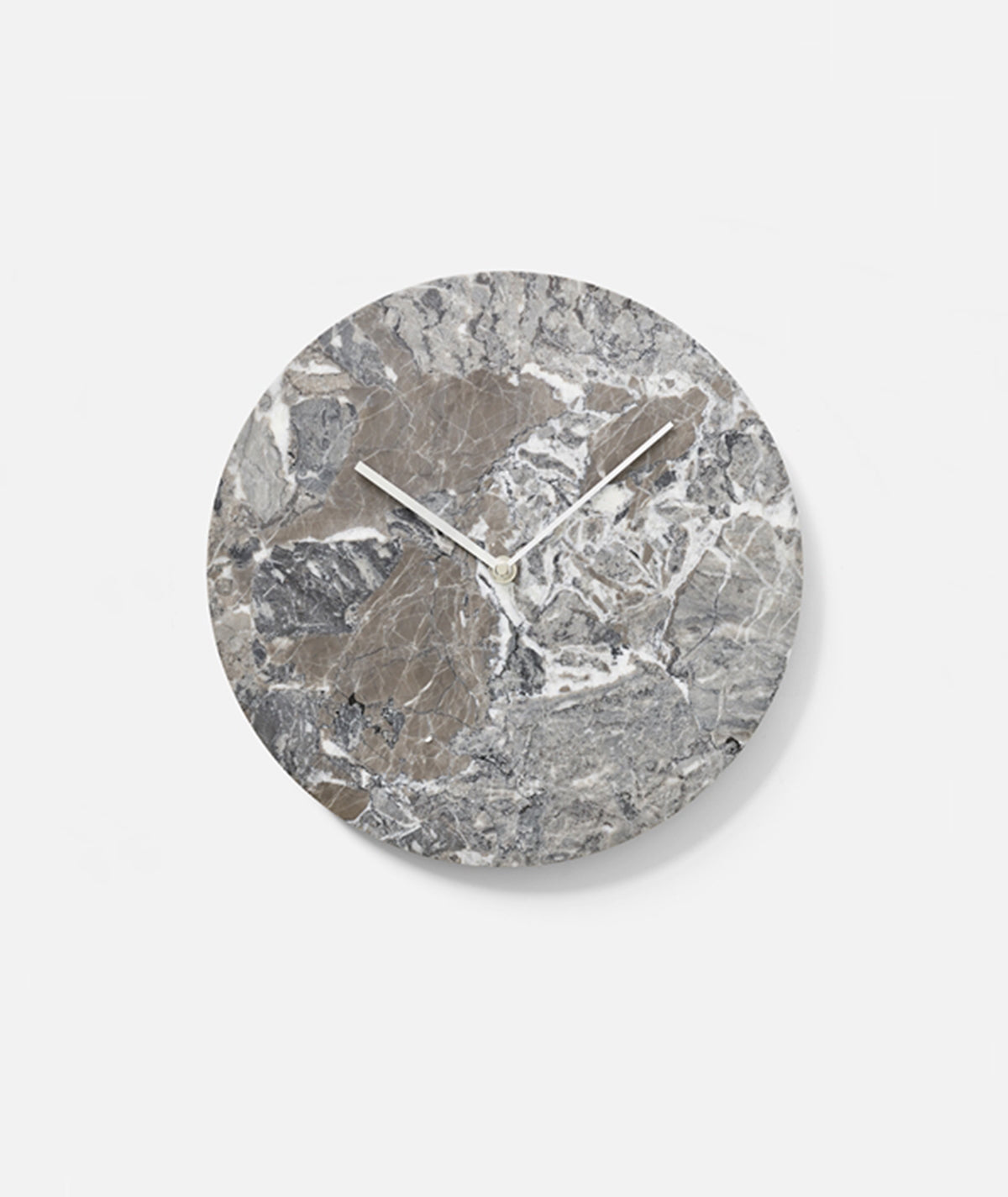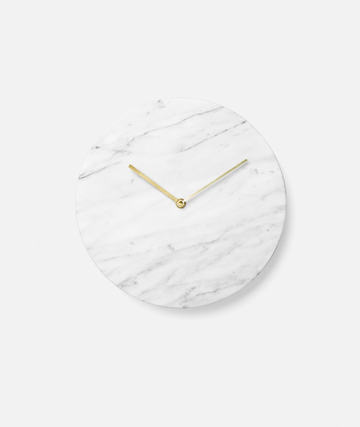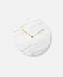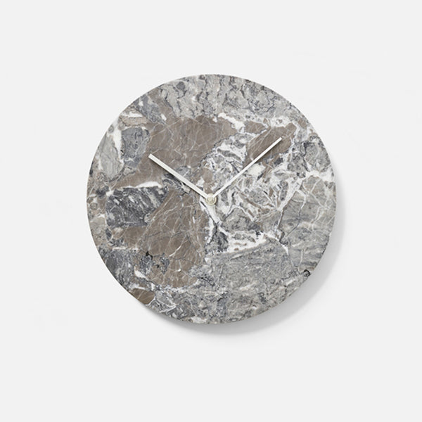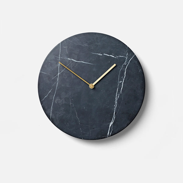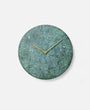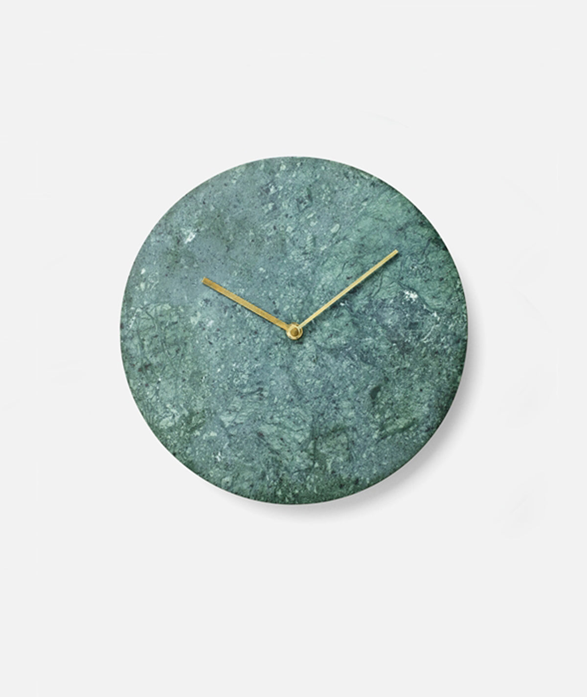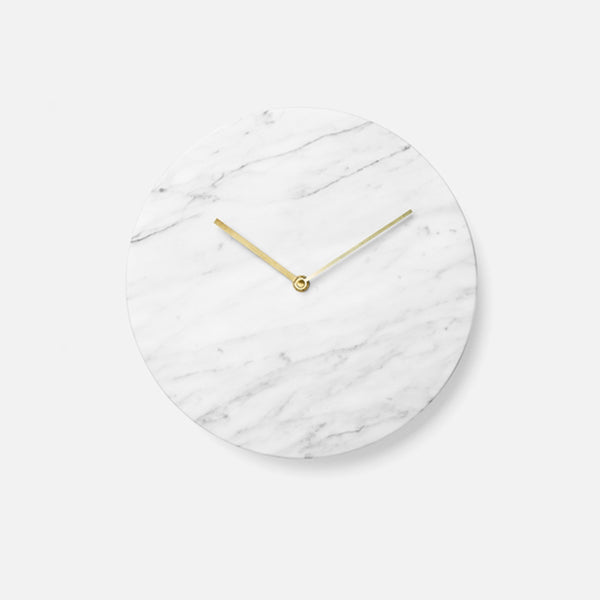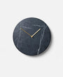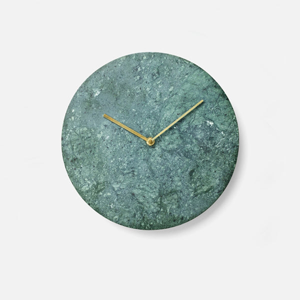 The marble clock is stripped of all unnecessary details with the hour and minute hands in lacquered brass being the only detailing on the face, keeping the design minimalistic. The clock is made from green marble (Verde Guatemala) and is available in a matte white or black.