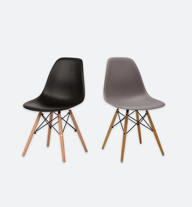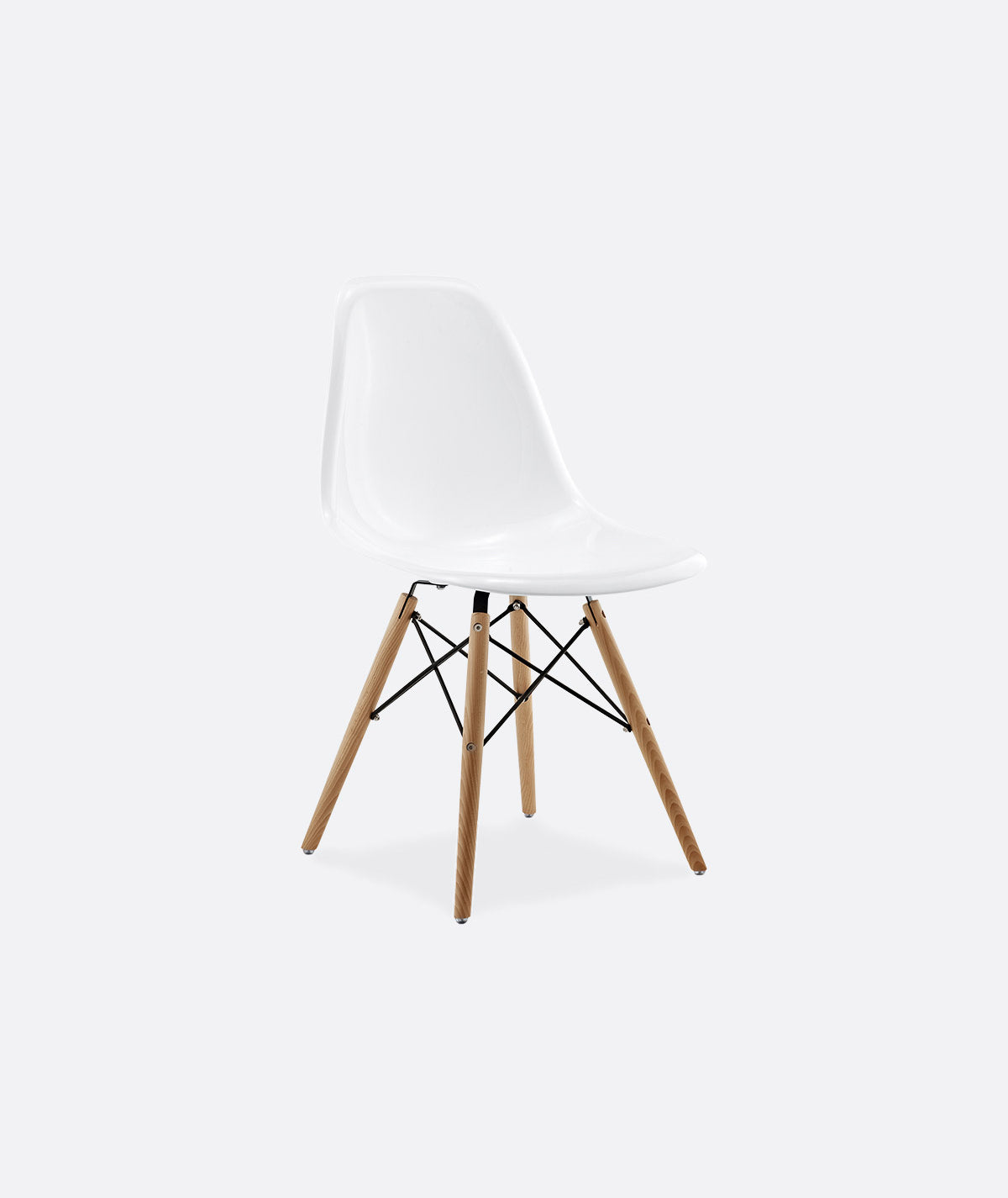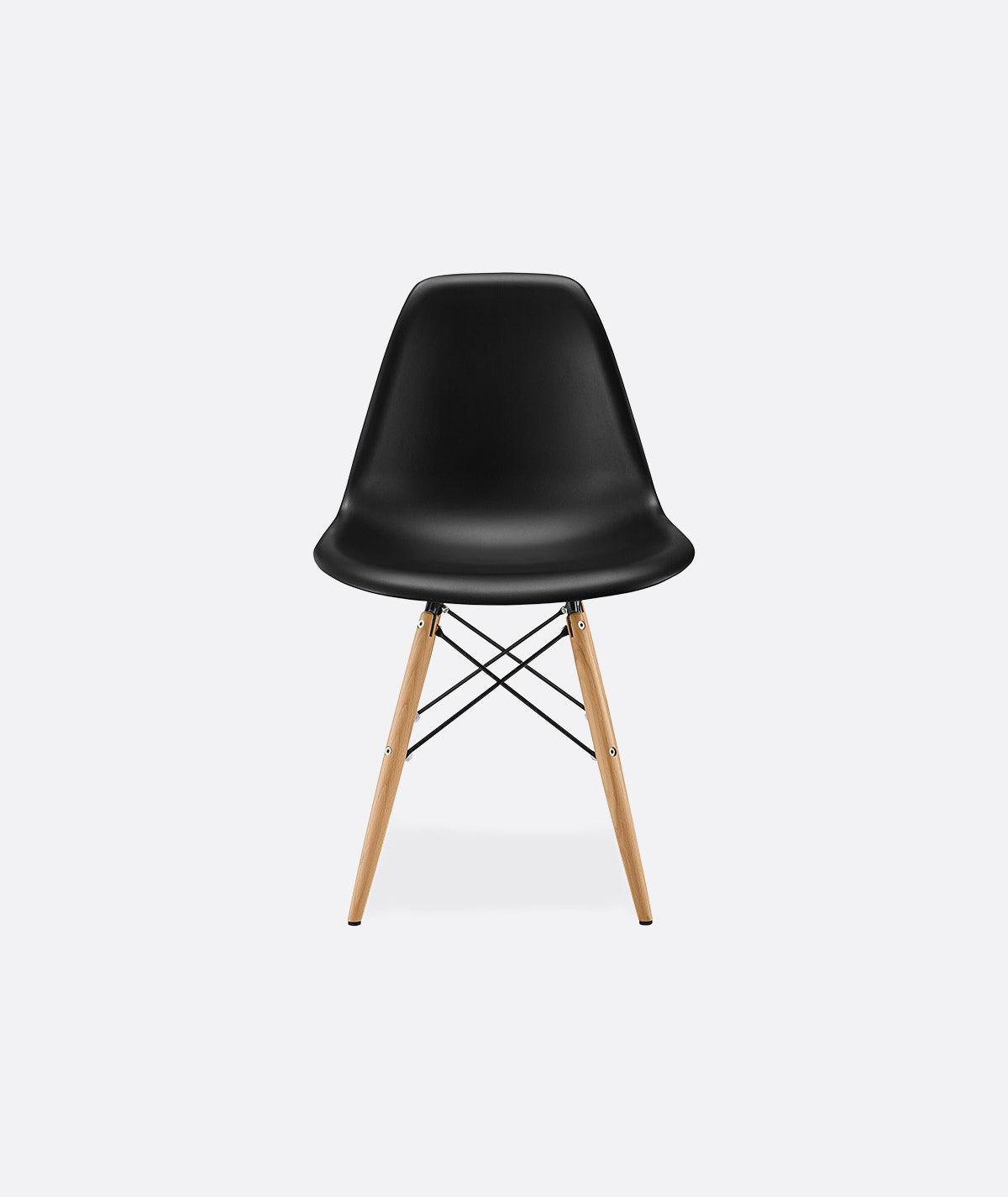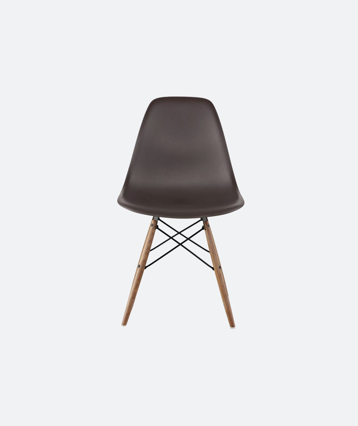 Combined the organically shaped seat shell with a four-legged wooden/iron base. The pairing of plastic and wood/iron gives the classic design a certain warmth and casual appeal. The seat shells can be fitted with seat cushions or full upholstery in a wide selection of fabric colors, enabling a multitude of individual configurations.